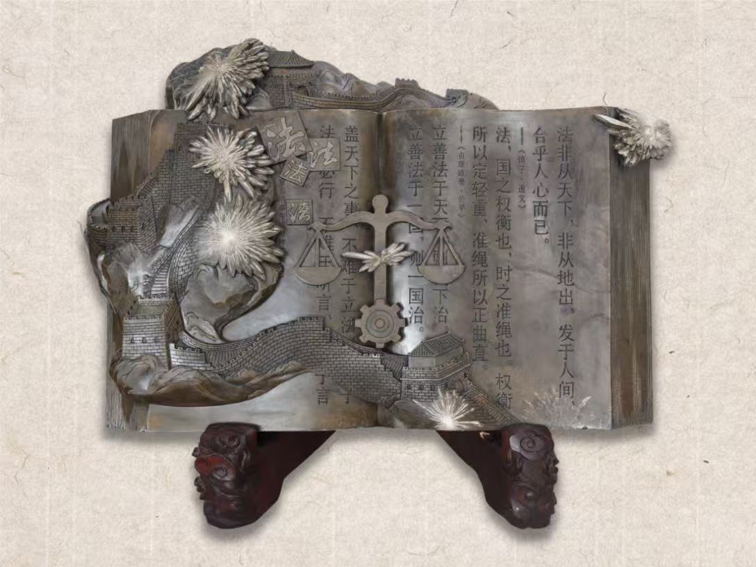 “《法韻菊華》以書本造型為整體設計,象征著法律是維護社會秩序和公正的基石。”瀏陽市司法局相關負責人介紹,《法韻菊華》將法律天秤設計于核心位置,石面中心重點雕刻法治名句,左側蜿蜒的長城象征中國,天然的菊花紋理巧妙地置于法律天秤的中間,寓意著法律與自然、公正、美好的和諧統一。